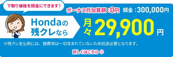 車両本体価格(消費税10%込み)2,792,900円★の場合●頭金0円 ●所要資金(割賦元金)2,792,900円 ●初回お支払い月額14,168円 ●2回目以降お支払い月額9,800円(×58回) ●ボーナス月加算額150,000円(×10回) ●最終回お支払い額※ ①新車に乗り換え0円 ②乗り続ける888,650円 ③車両を返却0円 ●お支払い総額 ①③の場合2,082,568円 ②の場合2,971,218円