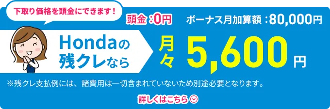車両本体価格(消費税10%込み)2,580,600円★の場合●頭金0円 ●所要資金(割賦元金)2,580,600円 ●初回お支払い月額5,448円 ●2回目以降お支払い月額4,100円(×58回) ●ボーナス月加算額148,000円(×10回) ●最終回お支払い額※ ①新車に乗り換え0円 ②乗り続ける1,032,240円 ③車両を返却0円 ●お支払い総額 ①③の場合1,723,248円 ②の場合2,755,488円