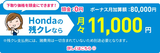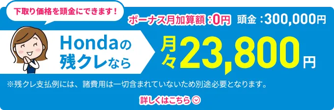 車両本体価格(消費税10%込み)2,230,800円★の場合●頭金0円 ●所要資金(割賦元金)2,230,800円 ●初回お支払い月額12,241円 ●2回目以降お支払い月額11,000円(×58回) ●ボーナス月加算額80,000円(×10回) ●最終回お支払い額※ ①新車に乗り換え0円 ②乗り続ける932,880円 ③車両を返却0円 ●お支払い総額 ①③の場合1,450,241円 ②の場合2,383,121円