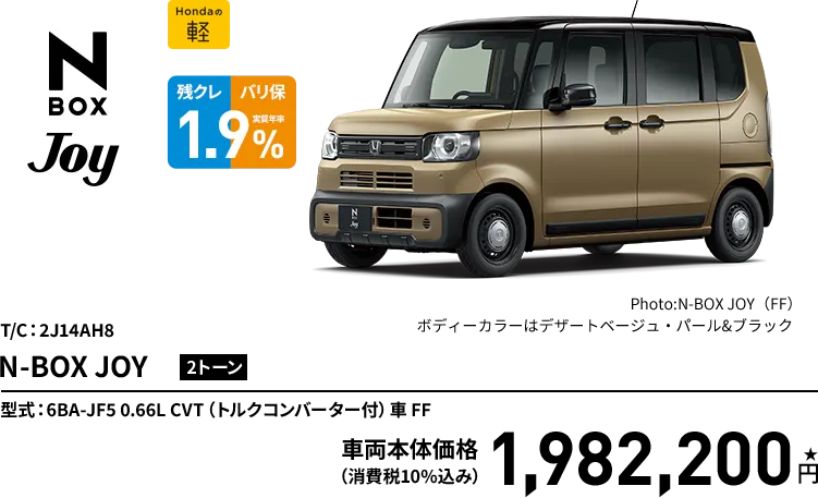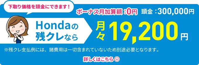 車両本体価格(消費税10%込み)1,893,100円★の場合●頭金0円 ●所要資金(割賦元金)1,893,100円 ●初回お支払い月額12,052円 ●2回目以降お支払い月額9,200円(×58回) ●ボーナス月加算額80,000円(×10回) ●最終回お支払い額※ ①新車に乗り換え0円 ②乗り続ける671,190円 ③車両を返却0円 ●お支払い総額 ①③の場合1,345,652円 ②の場合2,016,842円